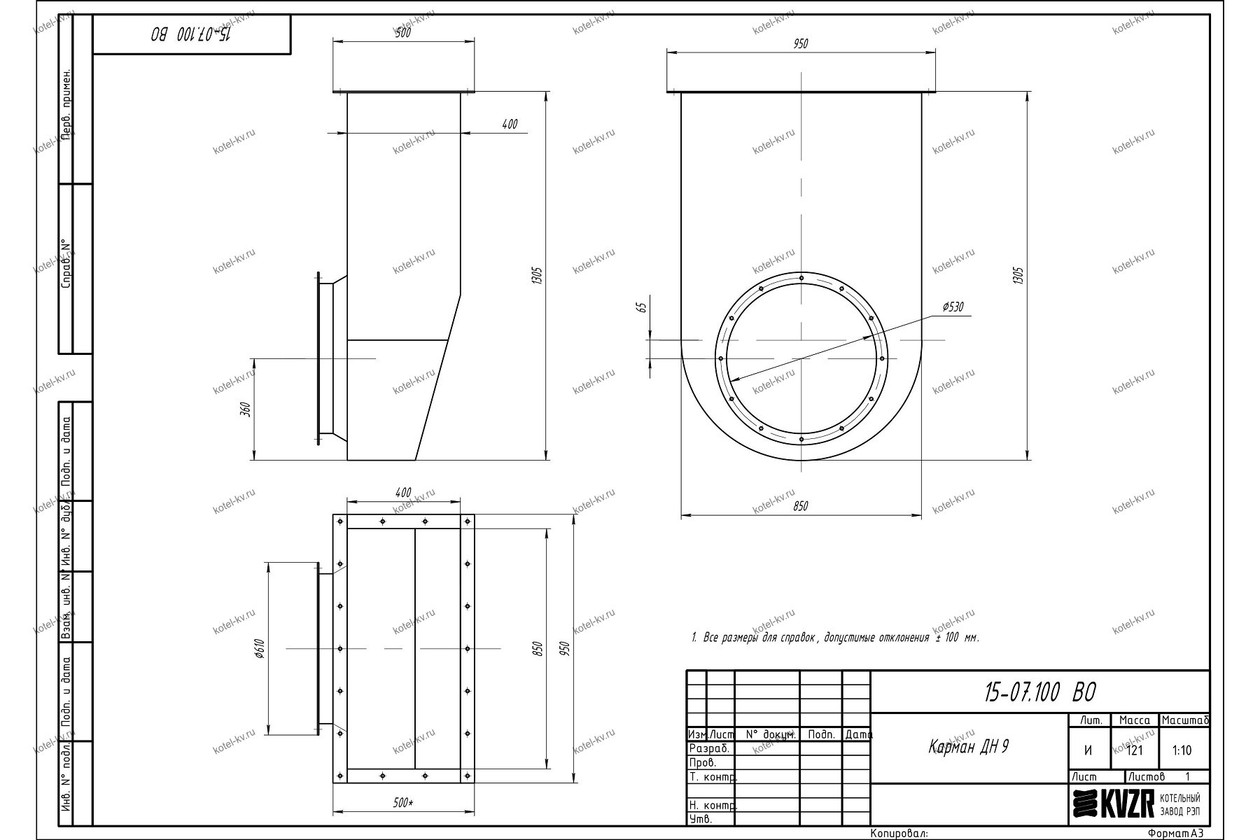 Всасывающий карман ДН 9 - металлическое устройство, которое устанавливается перед тягодутьевыми машинами (например, дымососами и вентиляторами) для защиты оборудования от попадания крупных частиц, посторонних предметов и мусора из потока газов или воздуха. Работает по принципу гравитации: тяжелые частицы оседают на дне кармана, снижая риск их попадания в вентилятор и повреждения механизма.